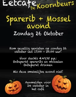 De sparerib & mossel avond op zondag 26 oktober van 17.00-20.00 uur voor €49,95 per persoon.