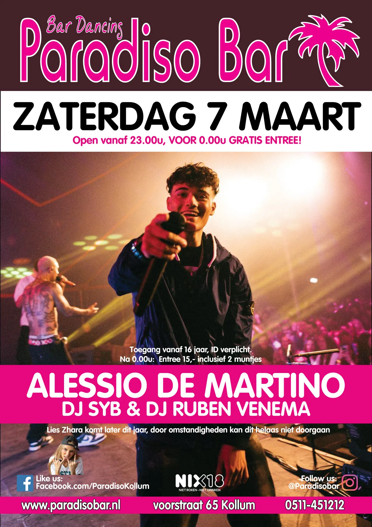 Zaterdag 7 maart! Lies Zhara komt later dit jaar, door omstandigheden kan dit helaas niet doorgaan Maar we hebben last-minute uitstekende vervanging kunnen regelen! Alessio, DJ Ruben Venema & DJ Syb