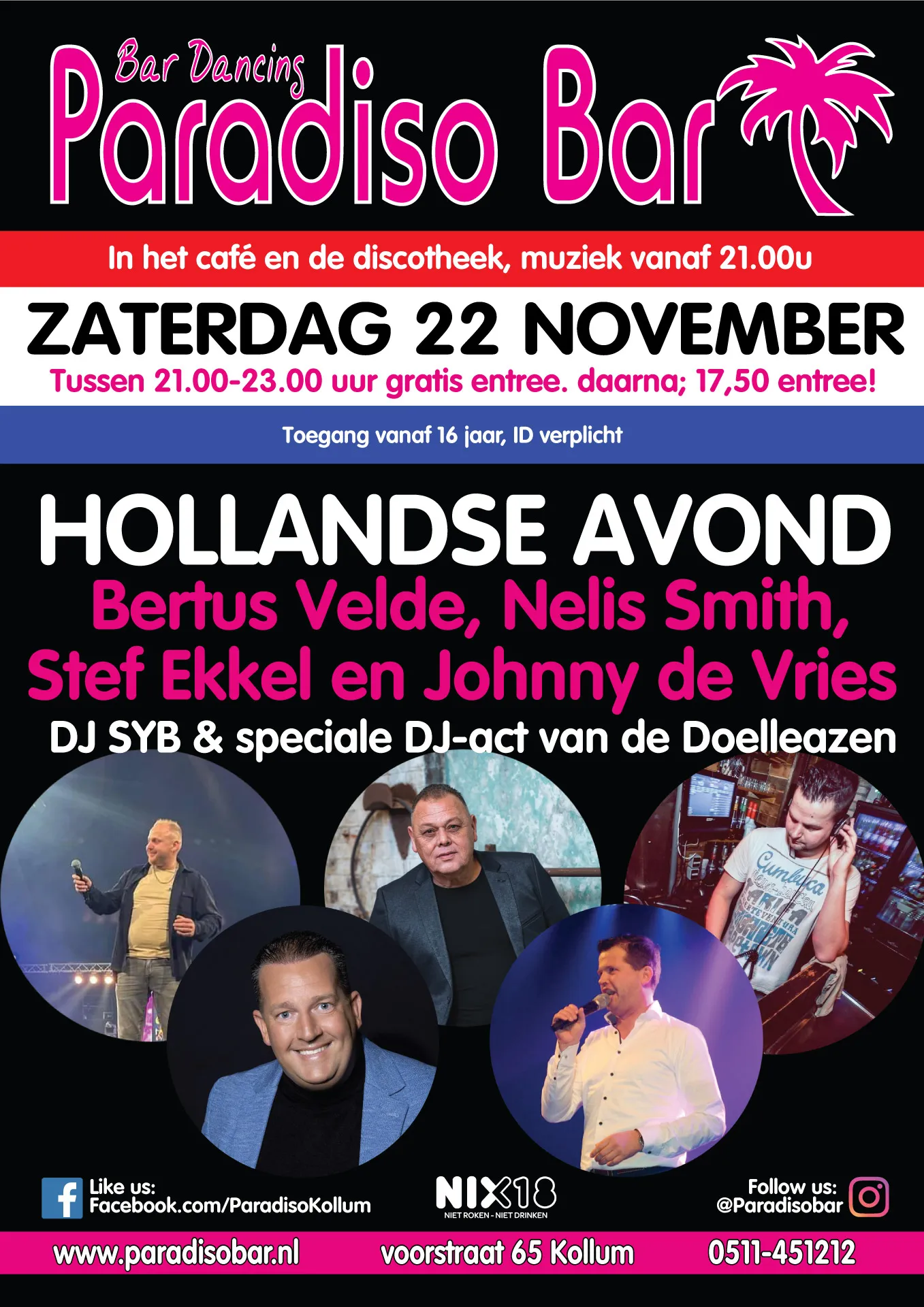 Bertus Velde, Nelis Smith, Stef Ekkel en Johnny de Vries DJ SYB & speciale DJ-act van de Doelleazen In het café en de discotheek, muziek vanaf 21.00u Tussen 21.00-23.00 uur gratis entree. daarna; 17,50 entree!